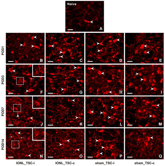 A very weak intensity of immunofluorescence (IF) of CX3CL1 was found in the TSC neurons of naïve rats (Figure 2A). CX3CL1-IF intensity increased bilaterally in the TSC neurons of both IONL- and sham-operated rats during all survival periods (Figure 2B–Q). Furthermore, CX3CL1 immunopositivity was observed not only in the neurons but also in glia-like cells in the TSC ipsilateral to the IONL at POD3 to POD14 (Figure 2F,J,N).