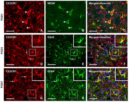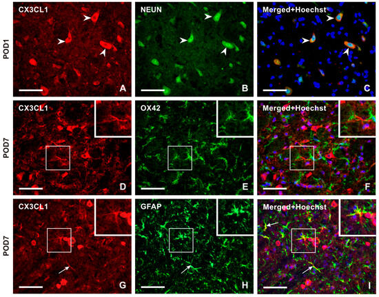 Double immunostaining confirmed CX3CR1-IF in NeuN-immunostained neurons (Figure 5A–C). Intense CX3CR1-IF was detected in OX42-immunopositive microglial cells of the TSC ipsilateral to the IONL during the early survival periods (POD1, POD3), with a reduction in both OX42- and CX3CR1-immunopositivity at POD7 and POD14 (Figure 5D–F and Figure S2). In contrast, the majority of CX3CR1-immunopositive glia-like cells at POD7 and POD14 showed colocalization with GFAP, indicating their astrocytic origin (Figure 5G–I and Figure S2).