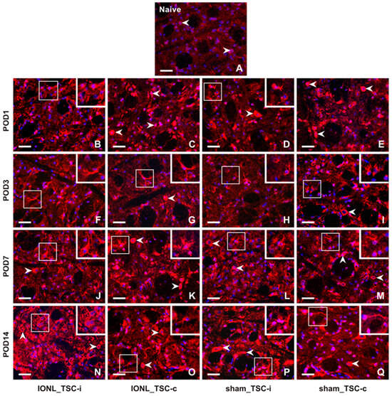 Representative images of the distribution of CX3CR1 immunofluorescence in the superficial layer of the TSC of naïve rat (A), IONL-operated rats (B,C,F,G,J,K,N,O), and sham-operated rats (D,E,H,I,L,M,P,Q) on POD1, POD3, POD7, and POD14. The nuclei of cells were stained with Hoechst 33342. Cryostat sections through the TSC ipsilateral (TSC-i) and contralateral (TSC-c) to the ligatures were immunostained for CX3CR1 under the same conditions. The immunofluorescence in the neurons, which were the dominant CX3CR1 positive cells in the TSC of naïve rat and TSC contralateral to IONL and sham operation on POD1, is indicated by arrowheads. At POD3, CX3CR1 immunostaining was also displayed in glia-like cells, as illustrated in the insets of the sections through the TSC contralateral to IONL and sham operation. In contrast, CX3CR1 immunofluorescence in the TSC of both the ipsilateral and contralateral sides was present in both neurons (arrowheads) and glia-like cells (insets) at POD7 and POD14. Scale bars = 50 µm.