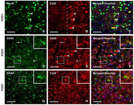 No or very weak CatS-IF was detected in NeuN-immunopositive TSC neurons of naïve rats. Double immunostaining revealed strong immunostaining for CatS in the superficial layer neurons of the ipsilateral TSC from POD1 to POD14 (Figure 6A–C and Figure S3), with no or very weak or moderate intensities of CatS-IF in the contralateral side as well as in both sides after sham surgery. In the TSC ipsilateral to the IONL at POD3 and POD7, OX42-immunopositive microglial cells showed moderate intensities of CatS-IF, with reduced intensity in these cells at POD14 (Figure 6D–F and Figure S3). At later survival time points (POD7, POD14), CatS immunostaining was observed in some GFAP-immunopositive astrocytes (Figure 6G–I and Figure S3).