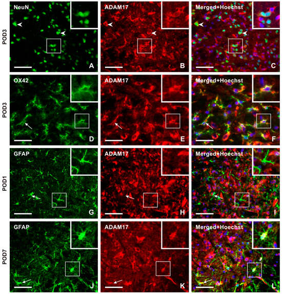 The panel of representative images illustrating the cellular distribution of the ADAM17 protein, which is another enzyme involved in releasing the soluble form of CX3CL1. Unlike CatS, ADAM17 immunopositive neurons were observed in both the superficial and deep layers of TSC, as illustrated by double immunostaining of ADAM17 with NeuN (A–C, arrowheads, and insets) as a representative section of the ipsilateral TSC at POD3. The intense ADAM17 immunostaining observed in the TSC neurons was bilateral at all time points. The presence of this enzyme protein in activated microglial cells of the ipsilateral TSC was revealed by double immunostaining with anti-ADAM17 and OX42 antibodies, mainly at POD1 and POD3 (arrows and insets in D–F as a representative illustration). The absence of ADAM17 immunofluorescence was observed after double immunostaining with GFAP, indicating that reactive astrocytes did not express this enzyme protein during POD1 and POD3 (arrows and insets in G–I as a representative illustration). However, on POD7 and POD14, ADAM17 immunostaining was found to colocalize with GFAP immunopositive reactive astrocytes. The results of the latter period are used for illustration (arrows and insets in J–L as a representative illustration). Scale bars = 50 µm.