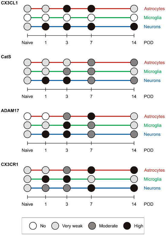 CatS immunostaining was found in microglial cells of the ipsilateral TSC predominantly at POD3 and POD7, coinciding with the pick of their activation [4]. Additionally, strong CatS immunofluorescence was detected in TSC neurons at POD1 and POD3, as well as in reactive astrocytes at POD7 and POD14. Our results demonstrated the presence of CX3CL1 on neurons throughout all time points and on reactive astrocytes at POD7 and POD14. These findings suggest that both neurons and reactive astrocytes may contribute to increased levels of sCX3CL1 during specific time periods. The released sCX3CL1 can then bind to CX3CR1 present on neurons and astrocytes, mediating their modulation in an autocrine manner.