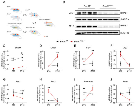 We examined the expression of core CCGs in the liver of mice at ZT0 and ZT12. At ZT0, Bmal1hep−/− mice displayed a significant upregulation of Cry1, Cry2, and Per2, with a significant downregulation of Rev-erbα. At ZT12, Bmal1hep−/− mice exhibited a significant upregulation of Clock, Cry1, and Rev-erbα, while Per1, Per2, and Rorα were significantly downregulated (Figure 1D–J). These findings collectively indicated substantial alterations in hepatic CCGs resulting from hepatocyte-specific Bmal1 knockout.