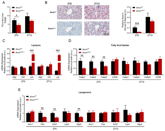 In this study, we employed Bmal1hep−/− mice to provide a detailed profile of metabolism and novel insights into the impact of Bmal1 on hepatic lipid metabolism. The main findings are summarized as follows: (1) Hepatocyte-specific knockout of Bmal1 disrupted the expression of CCGs in the liver. (2) Under conditions of unrestricted access to food and water with a standard chow diet, liver-specific knockout mice exhibited a decrease in liver TG levels at ZT0, primarily due to enhanced lipolysis, reduced lipogenesis, and diminished lipid uptake. (3) The β-oxidation function of liver mitochondria decreased at both ZT0 and ZT12.