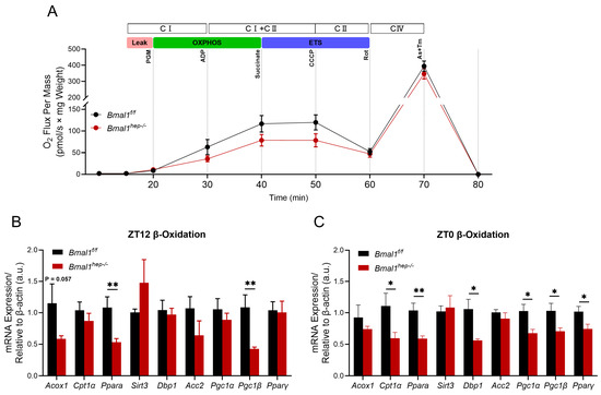 Combined determination of oxygen flux by O2k-Fluorometry in isolated hepatic mitochondria and expression of β-oxidation-related genes. (A). Oxygen flux changes relative to the liver weight. Bmal1f/f mice, n = 3; Bmal1hep−/− mice, n = 5. (B,C). Diurnal changes in expression of Acox1, Cpt1α, Ppara, Sirt3, Dbp1, Acc2, Pgc1α, Pgc1β, and Pparγ in the liver tissue of Bmal1f/f and Bmal1hep−/− mice. The values are presented as mean ± SEM. Bmal1f/f mice, n = 6; Bmal1hep−/− mice, n = 6. * p < 0.05, ** p < 0.01.
