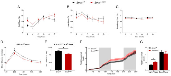 Profiles of systemic metabolism in hepatocyte-specific Bmal1 knockout mice. (A–C). Fat mass (A), lean mass (B), and free body fluid (C) for different time points during the experiment in Bmal1f/f mice and Bmal1hep−/− mice. (D,E). Glycemic levels during GTT (D) and AUC analyses of GTT (E) at the 4th week during the experiment in Bmal1f/f mice and Bmal1hep−/− mice. (F–G). Metabolic cage measurements of cumulative food consumption at the 14th week during the experiment in Bmal1f/f mice and Bmal1hep−/− mice. The values are presented as mean ± SEM. Bmal1f/f mice, n = 11; Bmal1hep−/− mice, n = 12. * p < 0.05.