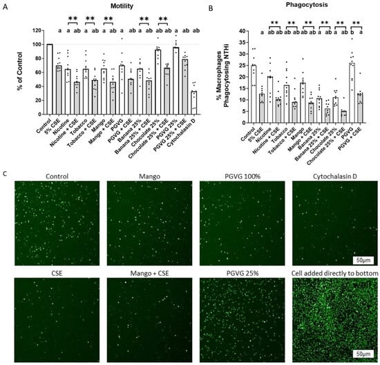 2.4. Dual Exposure Decreases Normal Healthy Monocyte Migration and Further Exacerbates Decreased Phagocytic Capacity