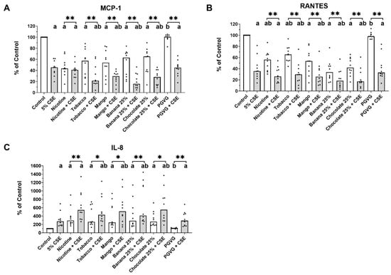 - Koyama, S.; Rennard, S.I.; Daughton, D.; Shoji, S.; Robbins, R.A. Bronchoalveolar lavage fluid obtained from smokers exhibits increased monocyte chemokinetic activity. J. Appl. Physiol. 1991, 70, 1208–1214. [Google Scholar] [CrossRef] [PubMed]