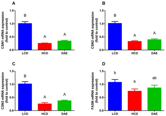 Effects of different diets on mRNA expression of milk synthesis-related genes in dairy cows. (A) Casein α (CSN1); (B) casein β (CSN2); (C) casein κ (CSN3); (D) fatty acid synthetase (FASN); (E) stearoyl COA desaturase (SCD); (F) acetyl CoA carboxylase α (ACACA). LCD: low-concentrate group, concentrate–forage = 4:6; HCD: high-concentrate group, concentrate–forage = 6:4; DAE: dandelion aqueous extract group, with the addition of 0.5% DAE in HCD diet. Different capital letters (A and B) indicate highly significant differences between treatments (p < 0.01). Different lowercase letters (a and b) indicate significant differences between treatments.