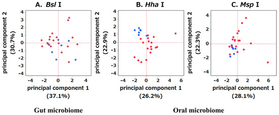 PCR amplification of 16S rRNA of dental plaque specimens was performed as reported by Sakamoto et al. [53]. The primers 6-FAM-labeled 27F (5′-AGAGAGTTTGATCCTGGCTCAG-3′) and 1492R (5′-GGTTACCTTGTTACGACTT-3′) were employed. The PCR products were purified using the PEG precipitation method [54]. As reported by Sakamoto et al., 20 U/10 µL of Hha I (5-GCG|C-3, Takara Bio, Kusatsu, Japan) and Msp I (5′-C|CGG-3′, Takara Bio) were used for digestion at 37 °C for 3 h [51]. Both dental plaque and feces were subjected to T-RF analysis, and each taxonomic unit was estimated and identified (Figure 5).