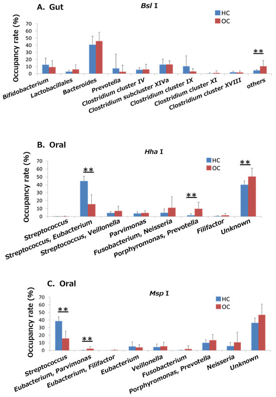 Comparison of the occupancy rates of the gut and oral microbiomes between the HC and OSCC groups. The percentage of bacteria detected in each sample was compared between the OSCC and HC groups. ** p < 0.01 (statistically significant).