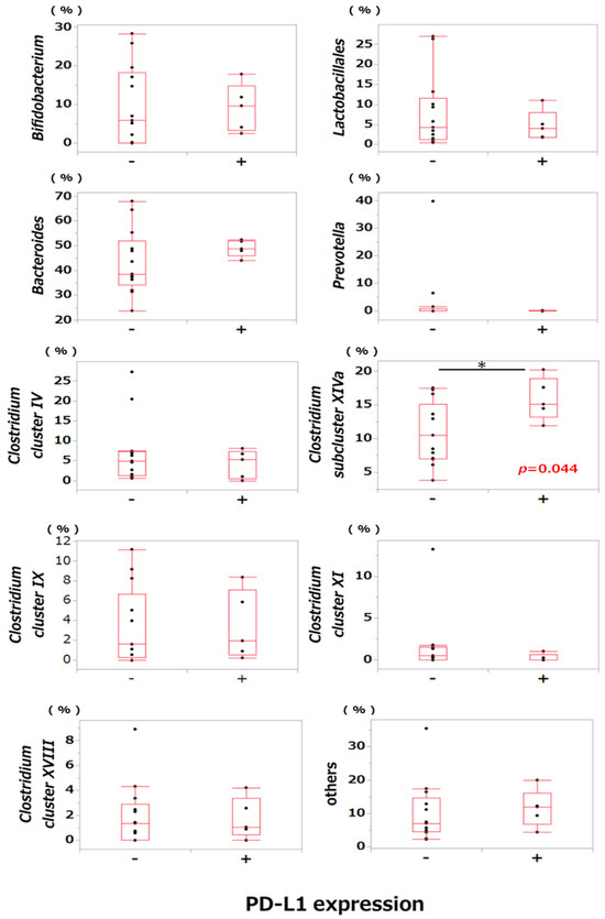 A comparison of bacterial abundance between the PD-L1-positive and PD-L1-negative groups revealed that the abundance of Clostridium subcluster XIVa in the gut microbiota was significantly greater in the PD-L1-positive group than in the PD-L1-negative group (p < 0.05, Figure 4). There were no significant differences in the occupancy of other bacteria between the two groups. Similarly, no differences were found in the oral microbiome between the PD-L1-positive and PD-L1-negative groups (p < 0.05, Figures S2 and S3).