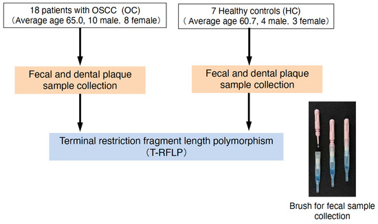 Fecal matter was collected from HCs and patients with OSCC before treatment using a stool collection kit (containing 100 mM Tris-HCl [pH 9], 40 mM ethylenediaminetetraacetic acid [EDTA], 4 M guanidine thiocyanate, and 0.001% bromotimol; TechnoSuruga Laboratory Co., Shizuoka, Japan) and stored at 4 °C. Dental plaque was collected from the tooth surface using sterile cotton swabs and stored at −80 °C. The collected samples were submitted to the TechnoSuruga Laboratory for T-RFLP analysis as described subsequently. Bacteria from fecal samples were defined as the gut microbiome, and those from dental plaque were defined as the oral microbiome.