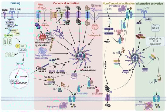 The physiological activation of NLRP3 is tightly regulated to avoid uncontrolled inflammatory responses and is beneficial against invading pathogens and tissue damage, whereas abnormal or chronic activation plays a detrimental role in cellular and body health. As depicted in Figure 1, NLRP3 inflammasome activation can occur via canonical, non-canonical, and alternative pathways []. Optimal activation of NLRP3 via canonical pathway requires priming step/Signal 1, initiated by the detection of extracellular PAMPs and endogenous cytokines by the PRRs, which then upregulates the NF-κB-mediated transcription of NLRP3, pro-IL-1β, and pro-IL-18 []. In addition, priming also regulates NLRP3 at the post-transcriptional level through DNA methylation, protein acetylation, and the use of microRNAs. For example, Wei et al. reported that NLRP3 expression was increased through NLRP3 promoter demethylation in response to Mycobacterium tuberculosis infection []. It has been revealed that the NLRP3 induction by lipopolysaccharide (LPS) priming is decreased by binding of the RNA-binding protein Tristetraprolin [] and miRNA-223 [] to 3′UTR of NLRP3. Moreover, priming also involves various post-translational modifications (PTMs) of the NLRP3 protein, such as ubiquitination and phosphorylation, that silence NLRP3 for subsequent activation by a second signal.