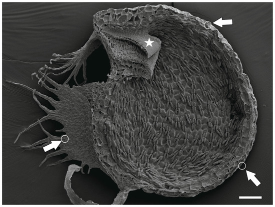 A sagittally halved trap of Utricularia dichotoma subsp. novae-zelandiae showing the external glands (arrow and white circle) and trap door (star), SEM, scale bar 200 µm.