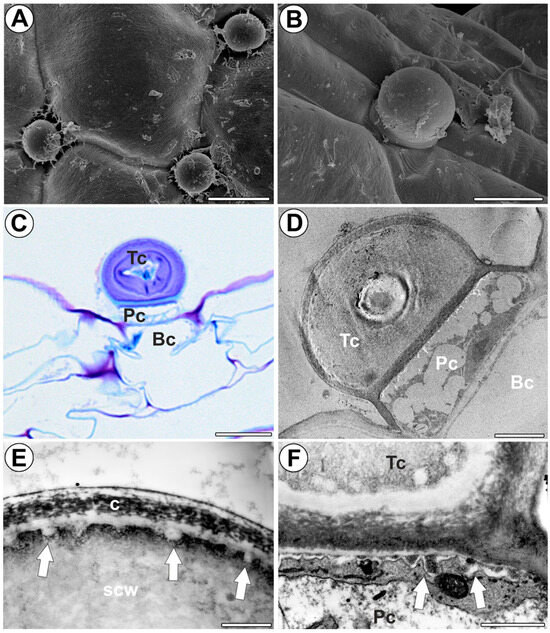 Distribution, morphology, and structure of the external trap gland of Utricularia dichotoma subsp. novae-zelandiae. (A,B) Morphology of the external trap glands, bar 25 µm, and bar 10 µm. (C) Structure of external gland: terminal cell (Tc), pedestal cell (Pc), basal cell (Bc), bar 10 µm. (D) Ultrastructure of external gland: terminal cell (Tc), pedestal cell (Pc), basal cell (Bc), bar 3 µm. (E) Ultrastructure of the terminal cell, note outermost cuticularized layer of the cell wall (c), cell wall ingrowths (arrow), secondary cell wall (scw), bar 1 µm. (F) Ultrastructure of the terminal cell (Tc) and pedestal cell (Pc), cell wall ingrowths (arrow), bar 1 µm.