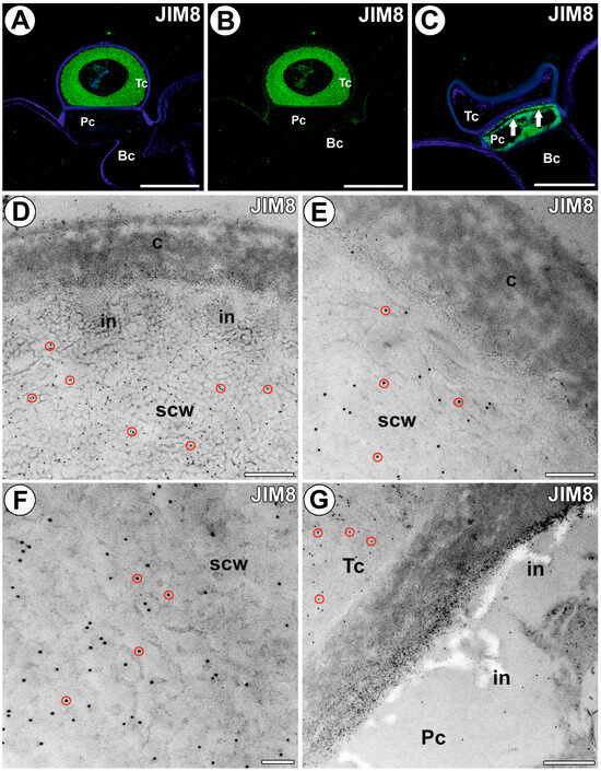 The arabinogalactan proteins detected in the external gland labeled with JIM8 (green color—signal of antibody, red circles—gold particle designation). (A,B) Arabinogalactan proteins (labeled with JIM8) were detected in the external gland; note strong fluorescence signal in the terminal cell; terminal cell (Tc), pedestal cell (Pc), basal cell (Bc), bar 10 µm and bar 10 µm. (C) Arabinogalactan proteins (labeled with JIM8) were detected in the external gland; note strong fluorescence signal in wall ingrowths in the pedestal cell (arrow); terminal cell (Tc), pedestal cell (Pc), basal cell (Bc), bar 10 µm. (D–F) Immunogold labeling with JIM8 in the terminal cell; the outermost cuticularized layer of the cell wall (c), secondary cell wall (scw), wall ingrowths (in), bar 400 nm, bar 200 nm, bar 100 nm. (G) Immunogold labeling with JIM8 in the terminal cell (Tc) and pedestal cell (Pc), cell wall ingrowths (in), bar 400 nm.