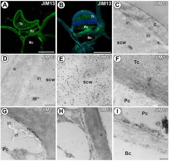 The arabinogalactan proteins detected in the external gland labeled with JIM13 (green color—signal of antibody). (A,B) Arabinogalactan proteins (labeled with JIM13) were detected in the external gland; note strong fluorescence signal in the terminal cell; terminal cell (Tc), pedestal cell (Pc), basal cell (Bc), bar 10 µm and bar 10 µm. (C–E) Immunogold labeling with JIM13 in the terminal cell; the outermost cuticularized layer of the cell wall (c), secondary cell wall (scw), wall ingrowths (in), bar 400 nm, bar 200 nm, bar 100 nm. (F) Immunogold labeling with JIM13 in the terminal cell (Tc) and pedestal cell (Pc), bar 300 nm. (G,H) Immunogold labeling with JIM13 in the pedestal cell (Pc), cell wall ingrowths (in), cuticularized later cell wall (c), bar 300 nm and bar 300 nm. (I) Immunogold labeling with JIM13 in the cell walls between pedestal cell and basal cell, bar 200 nm.