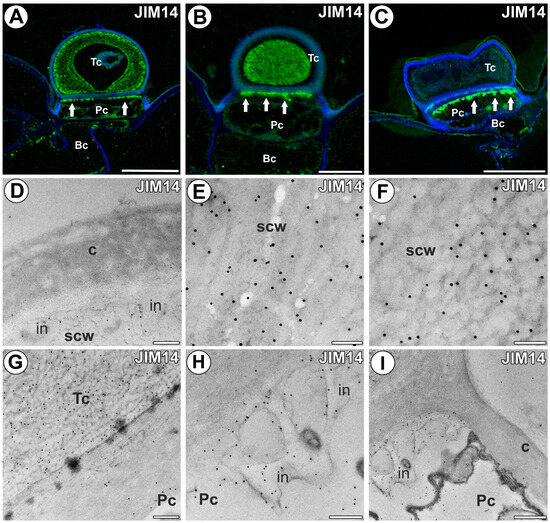 Within the terminal cell, a strong fluorescence signal detected by JIM14 was well observed in a thick secondary cell wall layer (Figure 5A,B). Within the cell wall, a layer with a stronger signal was visible; this layer of the wall was adjacent to the outer cuticularized cell wall layer (Figure 5A). No signal was observed in the outermost layer of the cell wall, which was cuticularized (Figure 5A,B). The epitope recognized by the JIM14 antibody was also detected in the cell wall ingrowths in the pedestal cell (Figure 5A–C). Gold particles did not occur in the outer cuticularized cell wall layer (Figure 5D). Numerous gold particles occurred in the secondary cell wall of the terminal cell (Figure 5E,F), but few in the cell walls between the pedestal cell and the terminal cell (Figure 5G). Numerous gold particles occurred in cell wall ingrowths of the pedestal cell (Figure 5H). Gold particles were nearly absent in the outer lateral cell wall of the pedestal cell (Figure 5I).