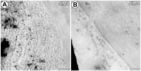Immunogold labeling with JIM4 in the external gland. (A,B) Immunogold labeling with JIM4 in the terminal cell; note only a few gold particles, bar 200 nm and bar 100 nm.
