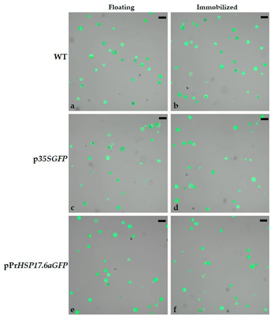 Confocal microscope images of tobacco protoplasts after FDA staining. WT—untransformed protoplasts; p35SGFP—protoplast transformed with p35SGFP plasmid; pPrHSP17.6aGFP—protoplast transformed with pPrHSP17.6aGFP plasmid. (a,c,e) Floating protoplasts; (b,d,f) protoplasts immobilized in K3 medium containing 0.6% agarose. Scale bars: 50 µm. Objective: 10×; zoom: 0.6.