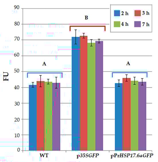Evaluation of fluorescence, measured by a fluorometer, after 2, 3, 4, and 7 h from immobilization of untransformed protoplasts (WT), protoplasts transformed with p35SGFP plasmid (p35SGFP), and protoplasts transformed with pPrHSP17.6aGFP plasmid (pPrHSP17.6aGFP). Each value represents the mean of three independent measurements ± SD. Different uppercase letters indicate significant differences among the FU values (p < 0.001).