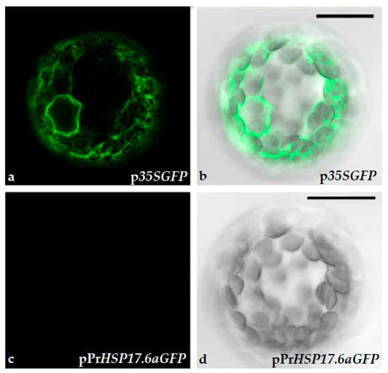 Confocal microscope images of immobilized tobacco protoplasts. (a,b) Protoplasts transformed with p35SGFP plasmid; (c,d) protoplasts transformed with pPrHSP17.6aGFP plasmid. (b,d) Bright field. Scale bars: 20 µm. Objective 40×, zoom 2.0.