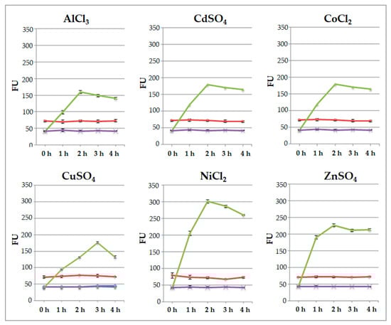 To test the ability of engineered protoplasts to sense the presence of metal ions, immobilized protoplasts were added with 50 μL of 20 μM each AlCl3, CdSO4, CoCl2, CuSO4, NiCl2, and ZnSO4 at room temperature. Fluorescence was measured by a fluorometer after 1, 2, 3, and 4 h. The values of fluorescence were measured in protoplasts transformed with p35SGFP plasmid, used as the control, as well as in protoplasts transformed with pPrHSP17.6aGFP plasmid. The values detected are shown in Figure 4 and indicate that the signals of p35SGFP-transformed protoplasts remain unchanged during the time course of all salt treatments. The fluorescence signals of pPrHSP17.6aGFP-transformed protoplasts increased during time course, reaching a maximum level after 2 h and remaining almost the same afterwards. When CuSO4 was used, and only then, the maximum induction was reached after 3 h and the fluorescence signal declined thereafter.