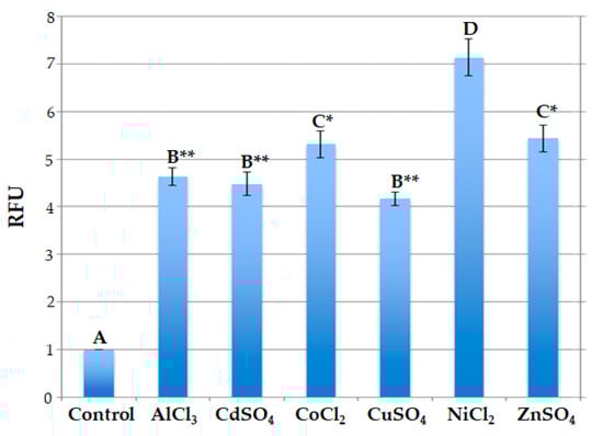 Comparison among the relative fluorescence values displayed by engineered protoplasts indicated that these values were similar when engineered protoplasts were treated with AlCl3 and CdSO4 or with CuSO4; in fact, in these cases, no statistically significant difference was observed in terms of relative fluorescence values. The fluorescence signals were also almost the same in the presence of CoCl2 and ZnSO4, and no statistically significant difference was observed in this case. On the contrary, statistically significant differences were observed when the florescence signal values of protoplasts treated with Ni ions were compared with those of all the other value groups. In particular, highly significant differences (p < 0.001) were observed when the values reached by protoplasts treated with Ni ions were compared to the ones obtained after treatment with Al, Cd and Cu ions, while significant differences (p < 0.05) were observed when they were compared to the ones obtained after treatment with Co and Zn ions (Figure 5).