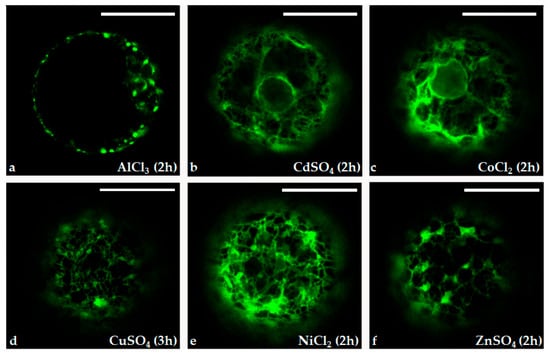 Moreover, the data obtained indicate that the signal’s intensity depends on the specific metal ion added. In particular, after 2 h, in the case of NiCl2 treatment, the signal was over 7-fold higher than that of the untreated protoplasts; it was more or less 5.5-fold higher after treatment with ZnSO4 and CoCl2; and it was 4.5-fold higher when using AlCl3 and CdSO4 salts. Following CuSO4 treatment, the maximum value was 4-fold higher (Figure 5).