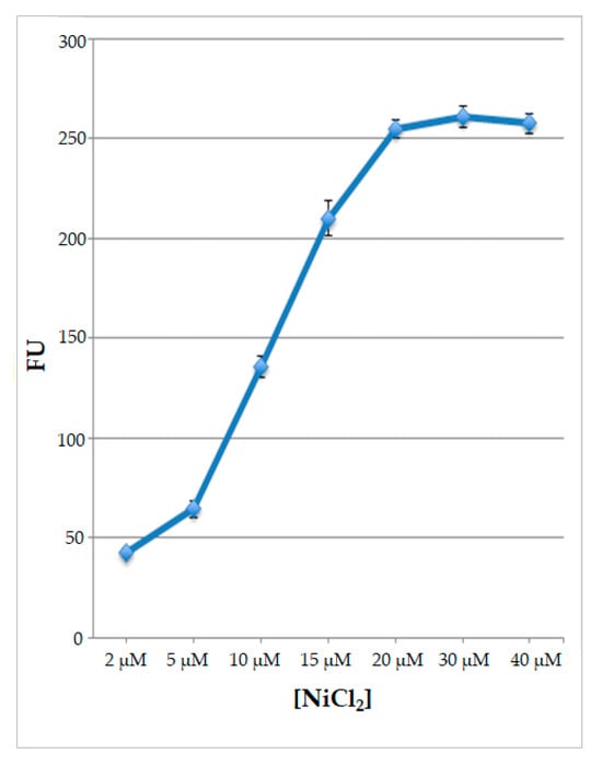 Since all the data indicated that nickel ions are the best inducers of fluorescence, to better characterize the response of the engineered protoplasts to this type of treatment, they were subjected for 2 h to various nickel ion concentrations, ranging from 2 μM to 40 μM. The results obtained indicate that, with rising Ni ion concentrations, the signal increased, reaching its maximum value at a concentration of 20 μM NiCl2; thereafter, the signal reached a plateau using higher Ni ion concentrations (Figure 7).