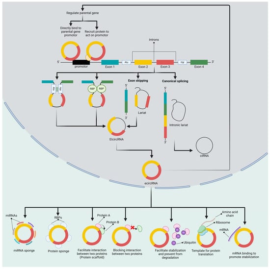 CircRNA biogenesis and its functions. CircRNA is a product of backsplicing, which begins with the joining of the downstream splice-donor site and the upstream splice-acceptor site, forming a circular loop-like structure. Alu or RNA-binding proteins (RBPs) can stimulate this interaction. The current circular loop-like structure, EIcircRNA, can also be generated via an exon-skipping event, and it might proceed through an internal splicing event to eliminate the intron, resulting in an ecircRNA. Moreover, canonical splicing can generate the other type of circRNA, ciRNA, which is entirely composed of introns. CircRNAs might be imported to the cytoplasm, where they primarily function. Mostly, circRNAs possess the ability to bind to miRNAs to regulate gene expression. CircRNA was recently found to be a template for protein translation or to establish an interaction with proteins. It can act like a protein sponge, which might later facilitate or inhibit the interaction between two different proteins. Utilizing protein sponge activity, some proteins avoid ubiquitin-mediated degradation by binding to circRNAs. Remarkably, some circRNAs have also been discovered to regulate their parental genes through various mechanisms, such as directly binding to the promotor or recruiting proteins to mediate gene expression.