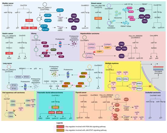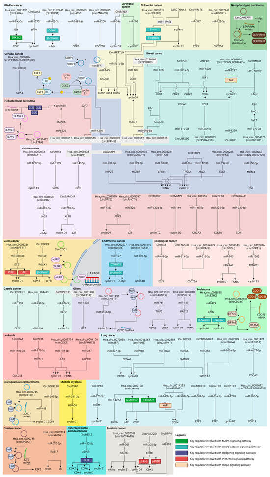 Oncogenic circRNAs and their path of action through various cell cycle regulators in bladder cancer, breast cancer, cervical cancer, colon cancer, colorectal cancer, endometrial cancer, esophageal cancer, gastric cancer, glioma, hepatocellular carcinoma, laryngeal cancer, leukemia, lung cancer, melanoma, multiple myeloma, nasopharyngeal carcinoma, oral squamous cell carcinoma, osteosarcoma, ovarian cancer, pancreatic ductal adenocarcinoma, and prostate cancer.