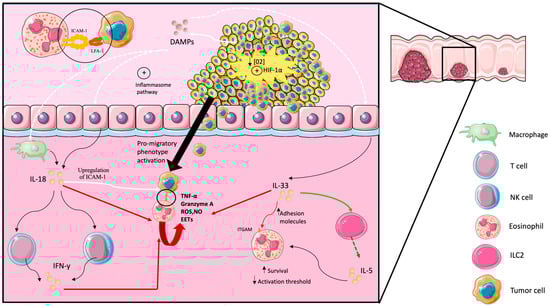 Furthermore, in macrophages and epithelial cells, these DAMPs and PAMPs promote the activation of the inflammasome pathway, which releases activated IL-18 []. This IL-18 promotes the release of IFN-γ in T and NK lymphocytes leading to further activation of eosinophils []. Moreover, this IFN-γ also triggers the upregulation of intracellular adhesion molecule 1 (ICAM-1) in tumor cells, facilitating the adhesion and infiltration of eosinophils into the tumor microenvironment []. This expression of ICAM-1 in tumor cells is more prominent in the center of the tumor and in front of invasion [], which could explain why eosinophils tend to concentrate in those areas. In the center of the tumor, it is potentiated through hypoxic conditions and hypoxia-inducible factor 1α (HIF-1α) activation []. Alternatively, in the front of invasion, it interacts with fibrinogen and other components of the extracellular matrix to activate a pro-migratory phenotype []. That indicates that the expression of ICAM-1 in tumor cells plays an important role in their adhesion and transmigration.