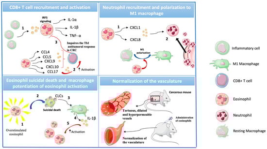 In CRC, the vasculature plays an important role in the molecular context of the microenvironment. The excessive production of pro-angiogenic factors leads to the formation of abnormal vessels. These vessels are tortuous, dilated, and hyperpermeable. This produces low perfusion, hypoxia, a pH decrease, and high interstitial fluid pressure within the tumor microenvironment. Such impairs the recruitment and survival of anti-tumoral effector cells and promote pro-tumoral immune cells []. Noteworthy, in mouse models, the administration of eosinophils promoted the normalization of the vasculature. This increased the amount of CD8+ T cells and M1 macrophages and strongly enhanced tumor rejection [].