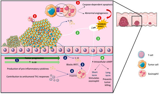 Another characteristic feature of CRC is the generation of extracellular acidosis due to the Warburg effect, which results in a hostile microenvironment that can inhibit the function of antitumoral immune cells []. This increases the intracellular production of cAMP in eosinophils, which stimulates eosinophils in the short term []. However, in the long term, the increased cAMP levels can lead to impaired eosinophil migration and reduced anti-tumor immune responses []. Moreover, 70% of CRC tumors display a high expression of Fas-L [], which binds Fas in the eosinophil surface and triggers caspase-dependent apoptosis, resulting in eosinophil depletion within the tumor microenvironment []. Noteworthy, eosinophil apoptosis contributes to abnormal angiogenesis [], which generates more acidosis, forming a feed-forward loop that further impairs eosinophil function and anti-tumor immune responses.