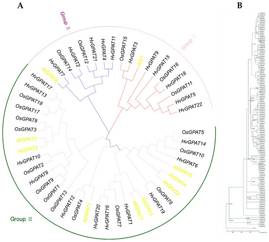 - Waschburger, E.; Kulcheski, F.R.; Veto, N.M.; Margis, R.; Margis-Pinheiro, M.; Turchetto-Zolet, A.C. Genome-wide analysis of the Glycerol-3-Phosphate Acyltransferase (GPAT) gene family reveals the evolution and diversification of plant GPATs. Genet. Mol. Biol. 2018, 41, 355–370. [Google Scholar] [CrossRef]