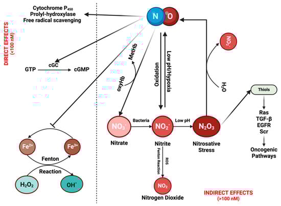 The chemical biology of nitric oxide (NO) and reactive nitrogen species (RNS): NO can exert its effects either directly or indirectly. Direct effects are associated with low NO levels (<100 nM). At these concentrations, NO can activate the enzyme cyclic guanylyl cyclase (cGC), initiating the conversion of guanosine triphosphate (GTP) into cGMP. cGMP then serves as a signaling molecule in various physiological processes, such as vasodilation and neurotransmission. Moreover, it contributes to drug detoxification by interacting with proteins from the cytochrome P450 family, which can also eliminate NO itself. In addition, NO can induce the hypoxia-inducible factor (HIF) pathway through the inhibition of prolyl-hydroxylase, while also functioning as a free radical scavenger by inhibiting the Fenton reaction and reacting with reactive oxygen species (ROS). Indirect effects of NO are driven by its reactive nitrogen species (RNSs). These reactive species can undergo various reactions, leading to their recycling back into NO while simultaneously activating diverse oncogenic pathways. Figure Made in BioRender.com (accessed on 21 February 2024).