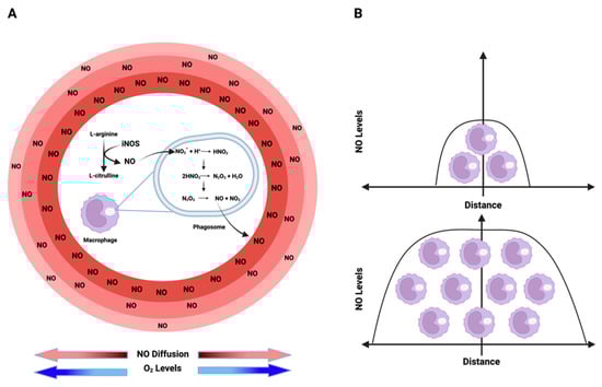 Nitric oxide (NO) kinetics: (A) NO is enzymatically synthesized through the oxidation of L-arginine by iNOS. Conversely, nitrite (NO2−), the product of NO, acts as an alternative NO reservoir in acidic environments, such as phagosome/lysosome lumens. In these regions, nitrite undergoes a series of reactions, ultimately generating NO and NO2, which then diffuse from the source to the surroundings in an O2-dependent manner due to O2’s impact on NO half-life creating an NO flux gradient with higher levels around the source and lower levels as the distance from the source increases. (B) The extent to which NO can diffuse from its origin and the levels of this free radical in a specific environment depend on the cell density of iNOS-expressing cells. Higher densities of NO-producing cells result in elevated NO levels and an increased diffusion distance. Figure Made in BioRender.com (accessed on 21 February 2024).
