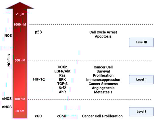 Cellular signaling and nitric oxide (NO) levels: NO effects vary based on its concentration. Three distinct nitrosative levels are identified: Level 1 (<100 nM) is linked to cGMP-related cell signaling, contributing to cancer cell proliferation; Level 2 (100–500 nM) involves HIF-1⍺ activation and subsequent pathways promoting cancer progression; Level 3 (>500 nM) is associated with toxic NO effects, primarily triggered by p53 activation, leading to cell cycle arrest and apoptosis. Figure Made in BioRender.com (accessed on 21 February 2024).