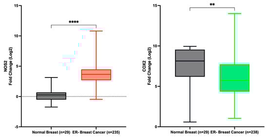 NOS2 and PTGS2 (COX2) expression in normal breast and ER- breast cancer. **** p < 0.0001; ** p = 0.0032.