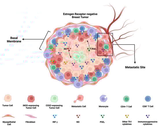 The requirement of IFN-γ and TNF-⍺/IL-1β for the upregulation of NOS2 and COX2 in human tumor cells implies that the microenvironment inducing NOS2-rich regions requires cells present that are releasing IFN-γ and other proinflammatory cytokines. Lymphoid cells, including CD8+ T effector cells, CD4+ Th1, and NK cells, are potential sources, serving as major cytokine contributors under inflammatory conditions [78]. In our previous study [8,76], we demonstrated that stromal-restricted CD8+ T cells and limited lymphoid aggregates were closely positioned but orthogonal to tumor regions exhibiting high levels of NOS2 and COX2. Additionally, IFN-γ staining corresponded to regions with elevated NOS2 levels. On the other hand, in “immune-cold” areas of the tumor with low CD8+ T cells (immune deserts), there was notably less NOS2 and IFN-γ. Interestingly, NOS2 and COX2 were not co-expressed in the same cell, and areas with higher concentrations of NOS2 were associated with a specific metastatic cellular landscape. NOS2 was identified at the tumor-stromal interface, while COX2 was present in the vicinity of immune desert regions closer to the tumor core. This NOS2/COX2 spatial configuration in specified areas of the tumor indicated an increased metastatic potential. In summary, this spatial arrangement suggests a significant association between NOS2 and COX2 niches that drive poor clinical outcomes in ER- breast cancer (Figure 5).