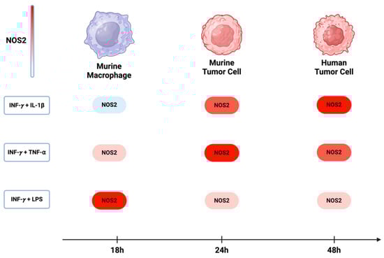 NOS2 induction in murine and human cells: In murine macrophages, the maximum induction of NOS2 occurs with a combination of INF-y and LPS. However, in both murine and human tumor cells, the highest expression of NOS2 is achieved when INF-y is combined with either TNF-⍺ or IL-1β. The induction of NOS2 in murine macrophages occurs approximately 18 h after treatment, while in murine and human tumor cells, there is a delay, with induction occurring around 24 h to 48 h. Figure Made in BioRender.com (accessed on 24 February 2024).