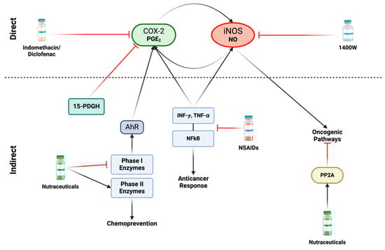 A variety of direct and indirect strategies can be employed to diminish the formation of NOS2 and COX2 niches. There are different non-steroidal anti-inflammatory drugs (NSAIDs) that can target iNOS and/or COX2 and exhibit potential repurposing capacity for treating different types of cancers (Table 1). Targeting NOS2 and COX2 can involve: (1) reducing expression or targeting critical downstream effectors (indirect approach), and (2) inhibiting NO and PGE2 production from NOS2 and COX2 (direct approach) (Figure 7). These strategies are applicable in different contexts including chemoprevention and co-adjuvant treatment aiming to prevent cancer development, metastasis, and tumor recurrence. In preventive approaches, the focus is on well-tolerated long-term therapies with minimal side effects, while in contrast, more aggressive measures can be considered during active treatment phases [79].