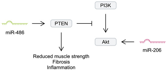 Another myomiR that has been investigated in the context of DMD is miR-206. Similarly to miR-133b, miR-206 seems to contribute to muscle regeneration. Injecting cardiotoxin into the tibialis anterior muscle of mice induced upregulation of miR-206. Knockdown of miR-206 has been associated with delayed muscle regeneration after injury. To study the impact of miR-206 on DMD, Lu et al. [46] generated mdx mice with miR-206 knockdown. After 4 weeks, animals lacking this myomiR developed significantly more severe dystrophic alterations compared with regular mdx mice. Furthermore, the authors found that miR-206 regulated satellite cell differentiation, as it affected the expression of negative regulators of this process, such as Notch3 [46]. Overexpression of miR-206 in dystrophic tibialis anterior muscle has been associated with upregulation of myogenic regulatory factors, such as RUNX1, MRF4, and MEF-2C. Furthermore, miR-206 stimulated the expression of utrophin A [47]. Upregulation of utrophin A is an important regenerative process in DMD; its elevated expression has been suggested to compensate for the lack of dystrophin [48]. In addition, miR-206 overexpression in dystrophic muscles has been associated with enhanced Akt signalling [47]. Importantly, regulating the Akt pathway has been suggested as a potential beneficial mechanism in DMD animal models [49,50]. Furthermore, dystrophin-deficient myoblasts show enhanced expression of phosphatase and tensin homologue (PTEN), a negative regulator of this signalling pathway [51]. Targeting PTEN could improve dystrophic muscle strength and reduce the necrotic area, fibrosis, and inflammatory infiltration [52]. Additionally, the Akt pathway mediated the pro-myogenic effects and stimulated hypertrophy of myotubes [53]. Therefore, enhancement of Akt signalling could be another beneficial mechanism induced by miRNAs in DMDs. PTEN is targeted by miR-486, a molecule downregulated in murine muscles deficient in dystrophin. Its overexpression in a murine DMD model improved histology (a decreased number of centralised myonuclei and increased myofibre size), reduced CK and ALT serum levels, and enhanced muscle physiology and strength [54] (Figure 2).