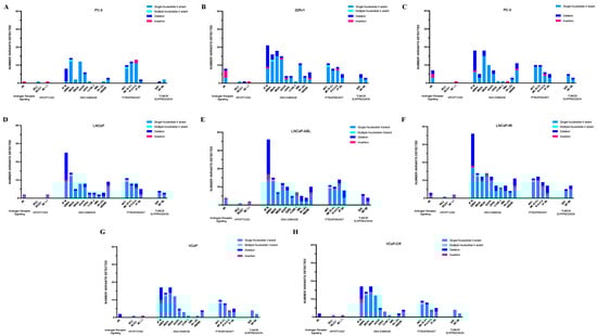 For the LNCaP-abl cell line (Figure 1E), our panel identified 24 missense mutations within the coding regions of the following genes: BARD1 (3), PIK3CA (1), MAP3K1 (2), NBN (2), ATM (2), BRCA2 (2), RAD51B (1), AKT1 (1), TP53 (2), CDK12 (2), BRIP1 (2), BLC2 (1), CHEK2 (2), and AR (1). In addition, we detected one in-frame deletion in MAP3K1, one in-frame insertion in AR, and one stop-gain in P1K3CA. Within the LNCaP-95 cell line (Figure 1F), our panel found 25 missense mutations within the coding regions of the following genes: BARD1 (2), PIK3CA (1), MAP3K1 (2), NBN (1), ATM (3), BRCA2 (3), RAD51B (1), AKT1 (1), PALB2 (1), TP53 (1), CDK12 (1), BRCA1 (2), BRIP1 (2), BLC2 (1), CHEK2 (2), and AR (1). In addition, we identified one in-frame deletion in MAP3K1, one in-frame deletion in AR, one in-frame insertion in AR, and one stop-gained in ATM. We also found one frameshift variant in each RAD51B, CDK12, and BRCA1. Genomic information of both cell lines is not available on the public databases (i.e., CCLE or COSMIC).