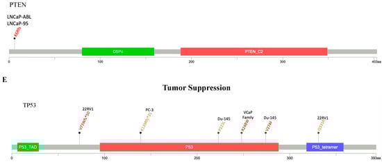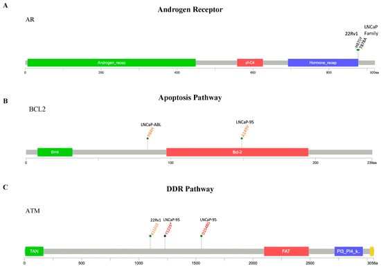 Clinically actionable alterations in key dysregulated pathways in PCa cell line models. Lollipop plots describe gene variants within the (A) AR, (B) apoptosis, (C) DDR, (D) PI3K/AKT/PTEN, and (E) tumor suppression pathways. Red font of variant description indicates the variant is confirmed to be pathogenic by ClinVar and orange indicates conflicting results from ClinVar and prediction engines. Lollipop plots mapping coding region mutations were produced using cBioPortal’s MutationMapper.