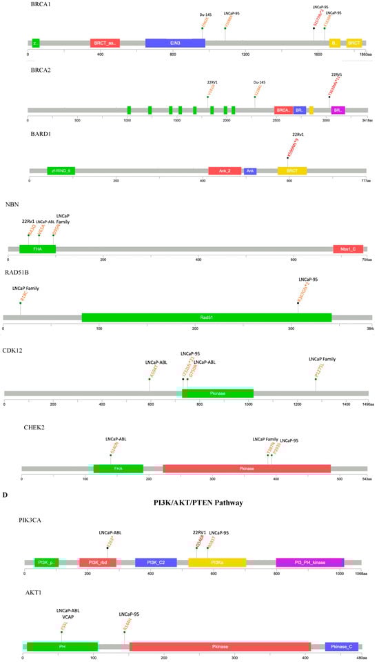 With the recent approval of PARP inhibitors for DNA damage repair (DDR) biomarker positive CRPC, the use of preclinical models is becoming even more important to explore mechanisms behind drug resistance and cancer progression. However, establishing cell lines from prostate tissue is difficult to achieve, with fewer than 20 new parental models developed in the past 50 years [,]. The growing significance of genetic alterations to PCa incidence and treatment [] reveals the importance of classifying each model at the genomic level. Recent PCa studies have utilized linked-read whole genome sequencing to characterize several cell lines according to mutation status [], analyze the expression of genes found in the main hormone pathways across six cell models [], and evaluate the crosstalk between androgen signaling and DNA repair genes in cell lines []. Our study characterized the genomic profiles of eight PCa cell lines representative of various stages of disease progression. We aimed to understand the relationship between detected alterations and therapeutic response, specifically in key PCa signaling pathways, including AR signaling, apoptosis, DNA damage repair, PI3K/AKT/PTEN, and tumor suppressor activity. After reviewing available commercial panels and failing to identify an option that included key genes in each of our pathways of interest, we designed a custom AmpliSeq Illumina DNA targeted gene panel. Our analysis led to the identification of novel, previously unrecognized mutations, as well as the validation of known alterations in commonly used PCa cell lines.