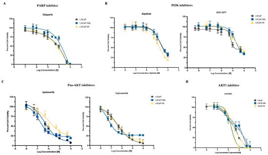 Following sequencing and analysis of variants, we considered alterations present in each pathway per cell line for results warranting further investigation. Due to the varying frequency of alterations between the parent and daughter cell lines within dysregulated PCa pathways, we treated the LNCaP family cell lines with the PARP inhibitor olaparib, PI3K inhibitors alpelisib and GDC-0077, and AKT inhibitors ipatasertib, capivasertib, and A-674563.