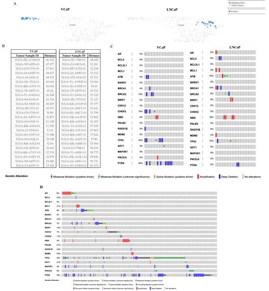 Alteration profile comparison between preclinical models and clinical samples from PCa patients. (A,B) Celligner alignment of cancer cell lines and tumor samples. UMAP visualization showing the genome-wide gene expression-based alignment of VCaP and LNCaP cell lines compared to patient tumor gene expression data. Representation was created via the DepMap Celligner tool. Blue circles represent cell lines and blue plus signs represent closely related patients. (C) cBioPortal OncoPrint of queried genes using whole-exome sequencing of TCGA primary cancer patients identified as closely related to VCaP and LNCaP cells and of (D) mCSPC MSK patient population analyzed by Stopsack et al. [].